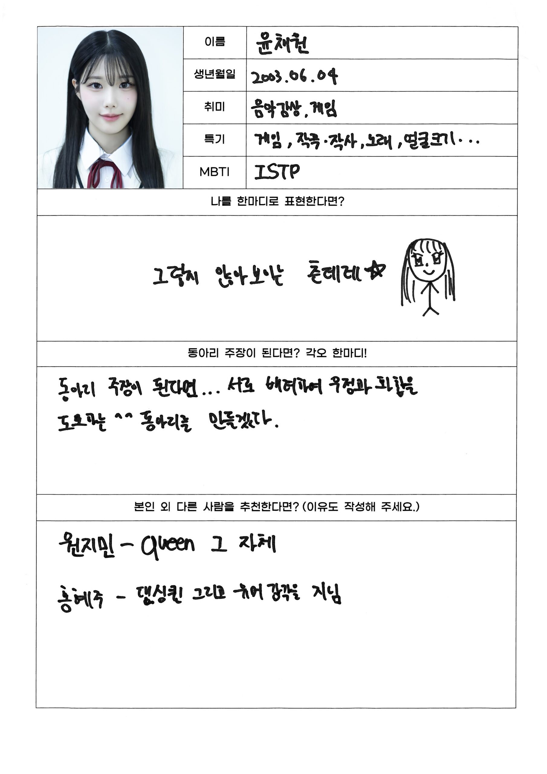– Hobby: Listening to Music. (Weekly Idol Self Profile)