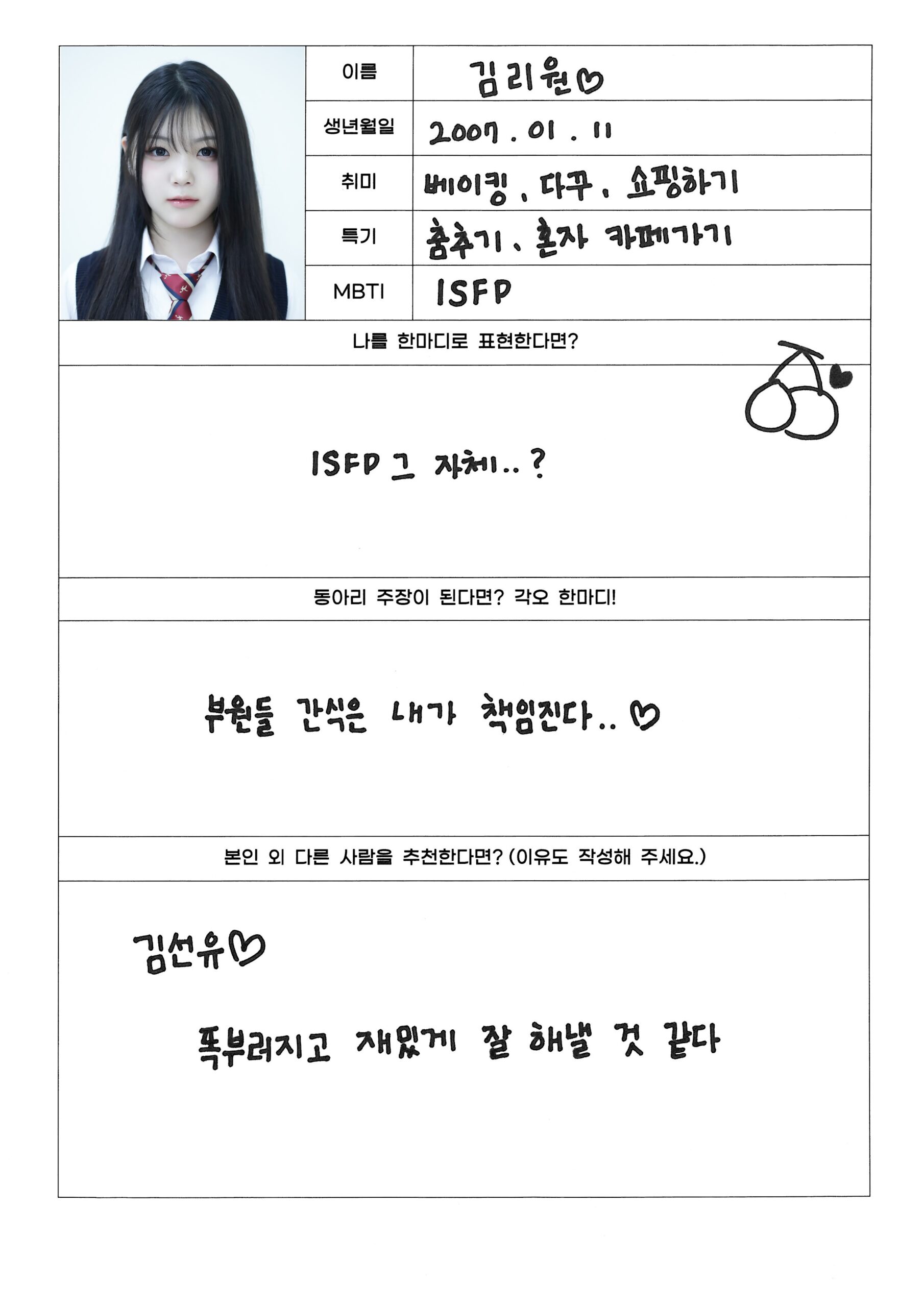 Note 3: Source for the updated MBTIs – members self-written profiles: Chaewon, Riwon, Boeun, Seonyou. Hyungseo updated her MBTI to ISFJ in November 2025 (Weverse).